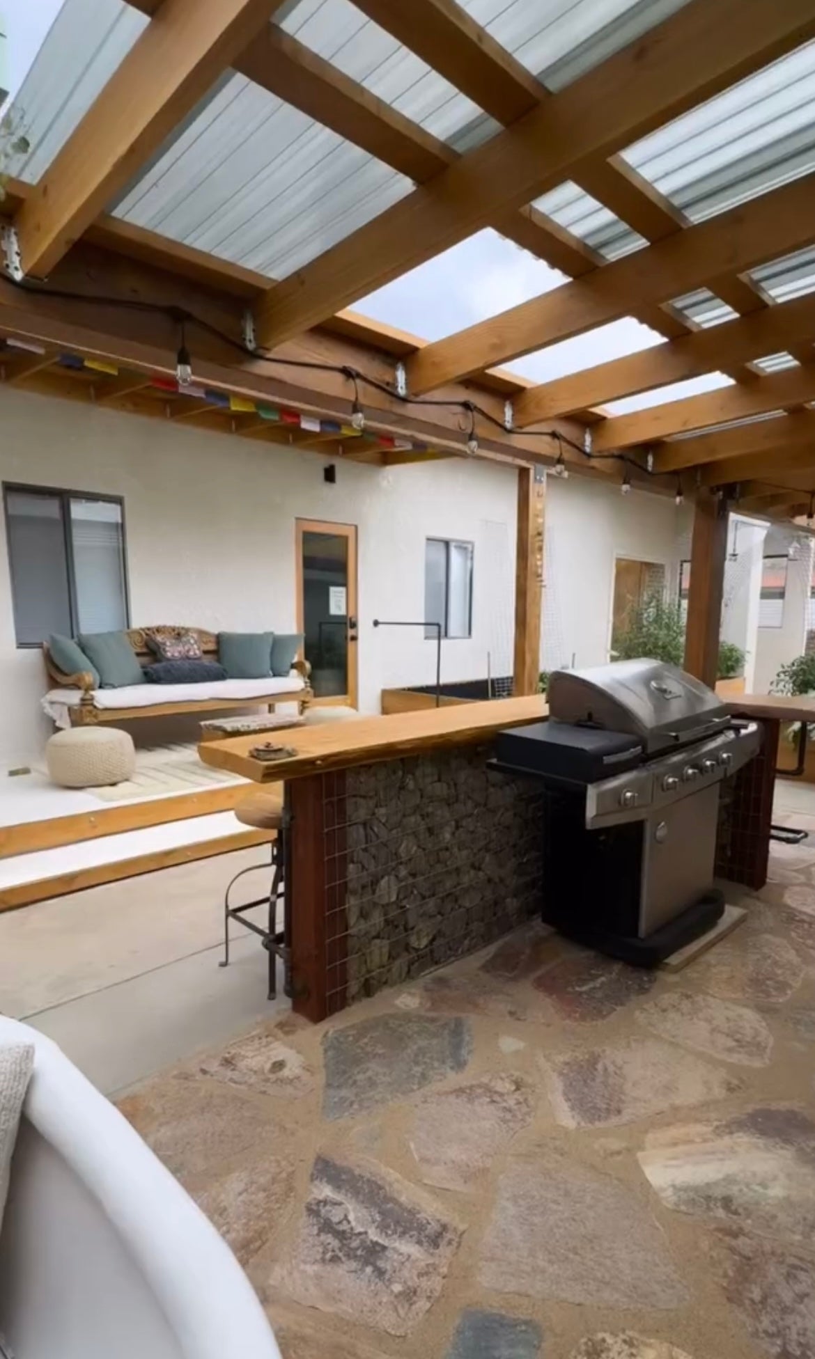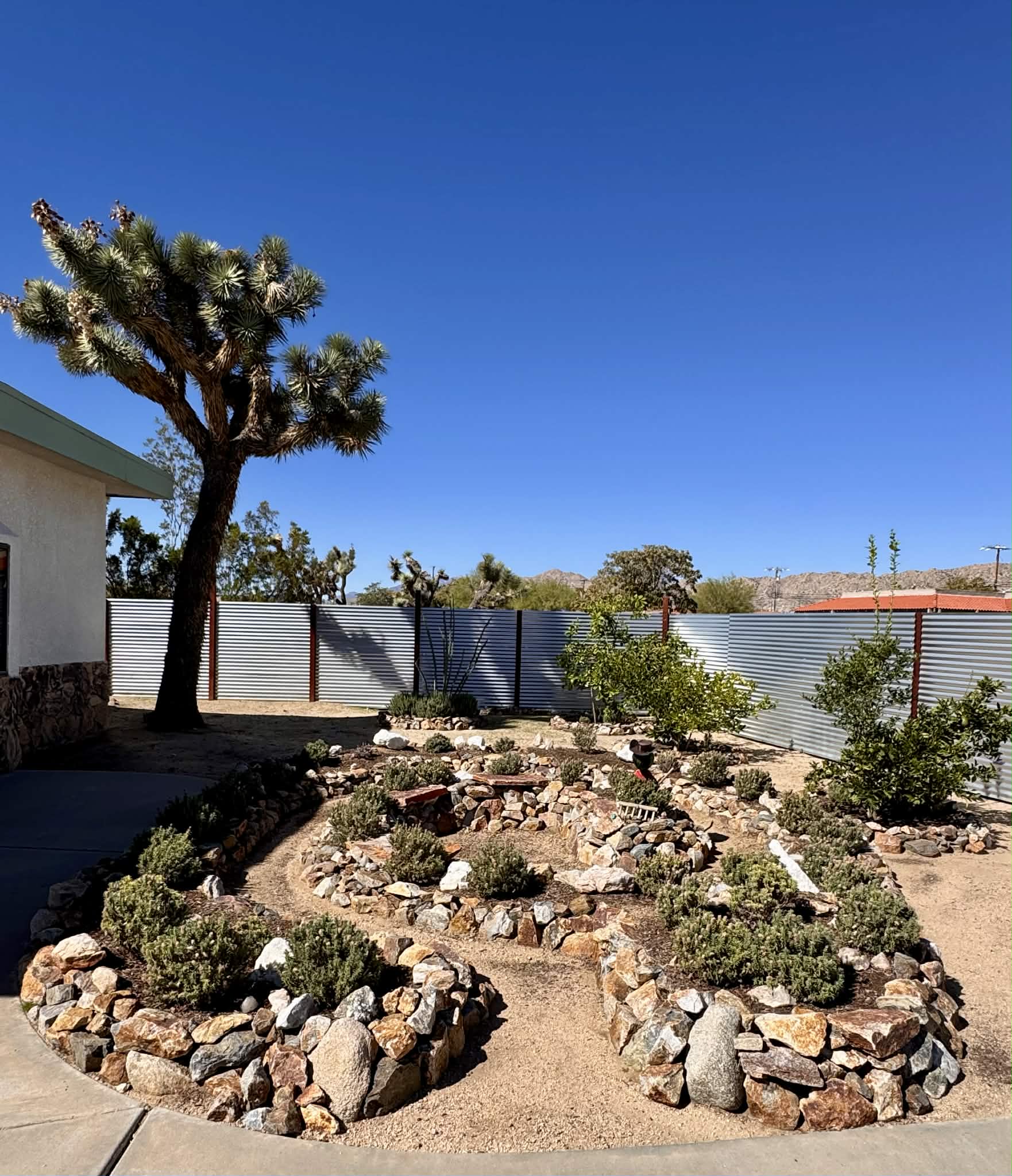 There is ample space to be on the grounds to sit and find some quiet and connection. A comfortable living room with fireside, and inside dining table. There is large outdoor table and seating under the Joshua Trees.