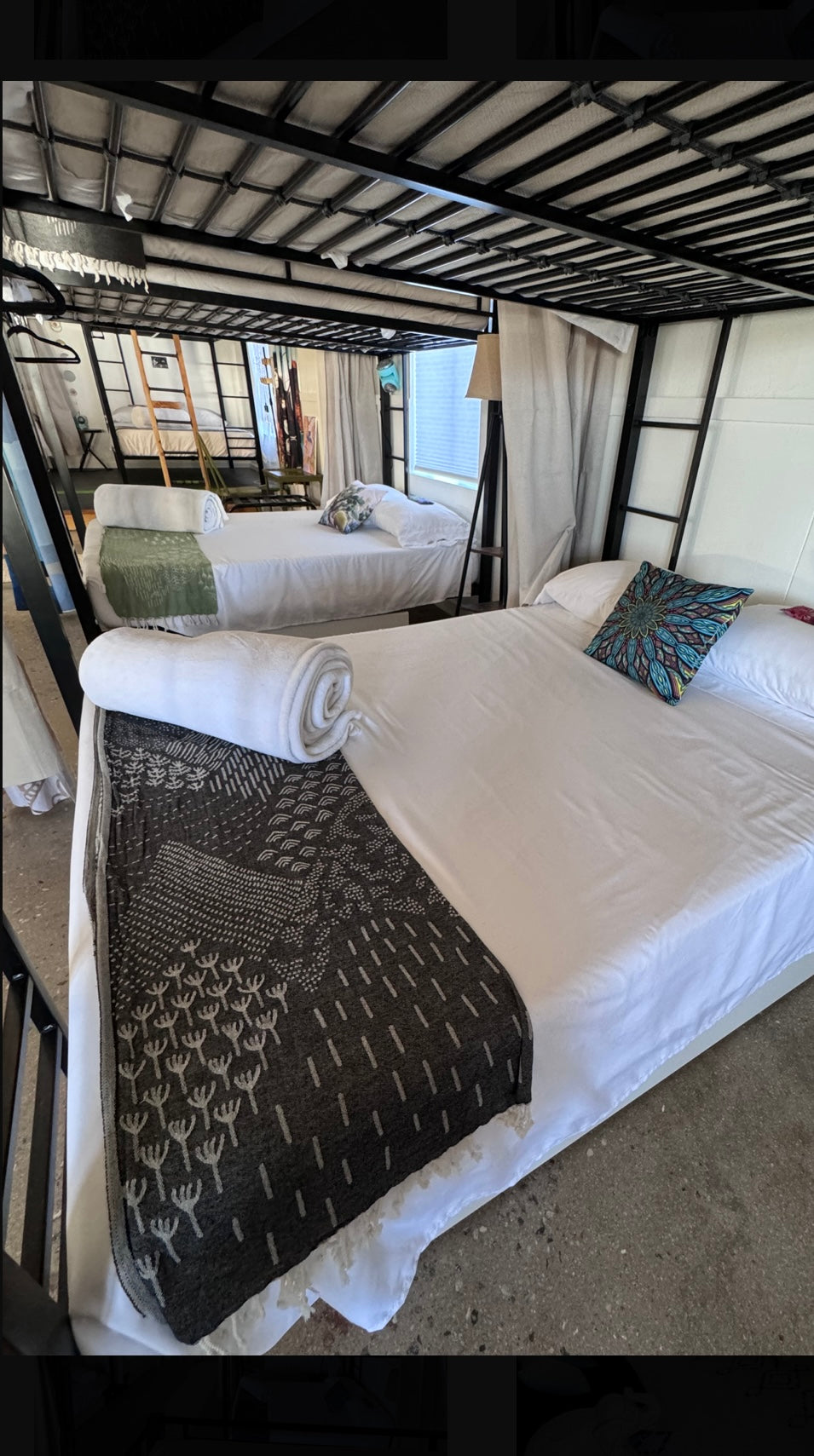 Queen size beds in a calm and climate controlled sleeping dorm. Lamp, space to keep your things and a charging station for each. There is a bathroom en suite that is shared. The main showers and lockers are in the main house a few steps away. Bath towels are provided.